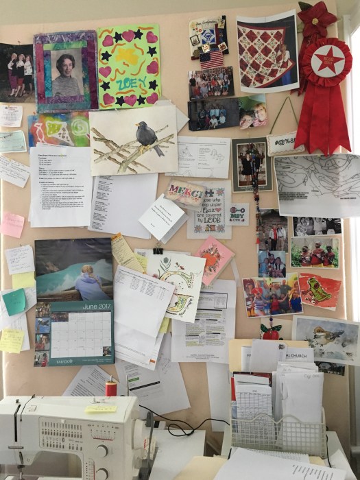 And the memories! “Arts and Craps” pieces from afternoons with The Littles, a photo taken in 1985 with my co-workers at Indialantic Elementary, my mom’s retirement photo made into a mini-quilt by my sister Sally, a photo of some Masai women taken in Kenya in 2000, ribbons won at quilt shows. It goes on and on.