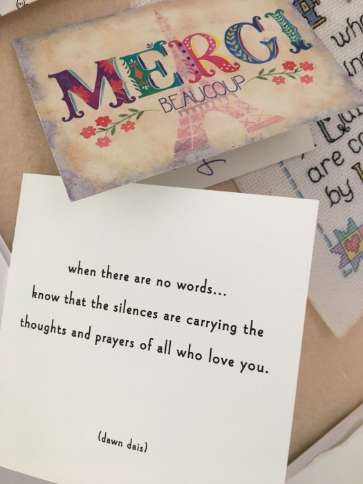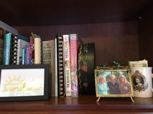 Cookbooks. I don’t cook but all of these have long-ago memories attached. A mug from Queen Elizabeth’s Silver Jubilee in 1977. A sweet embroidered piece from a friend when I was dealing with thyroid cancer. Snapshot of the sisters.
