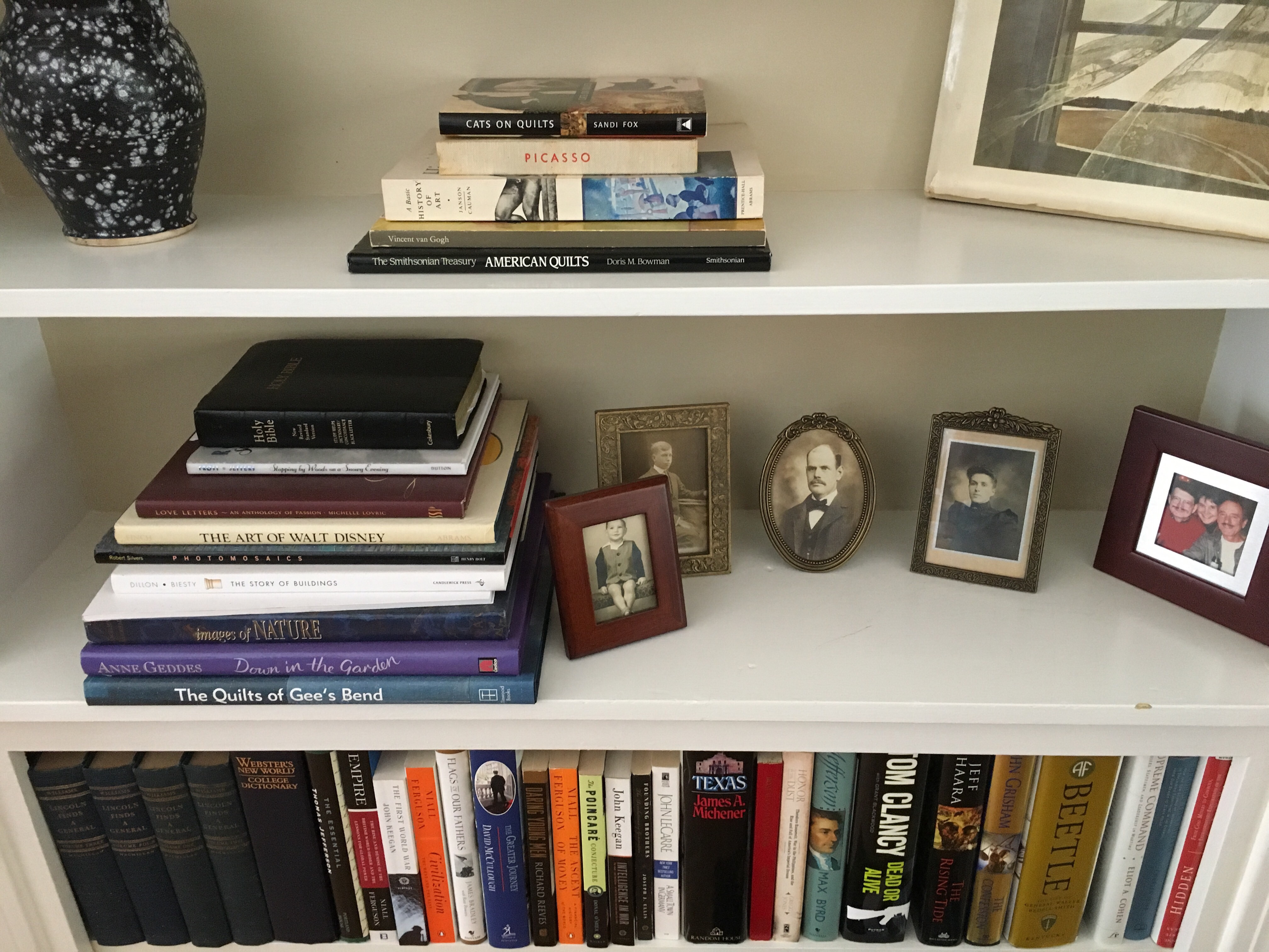 Old memories and new in one bookshelf. Ancestors and current art work.