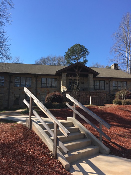 Day Two at Elder Camp (aka Quilt Retreat) is crispy bacon day. The people who fix our food lure us to the large stone dining hall in the morning with the smell of country bacon. How lucky are we to spend four nights in a cabin in the Georgia woods with three meals a day laid before us? Country cookin’ for sure: fried chicken (twice so far), fried okra, French Fries, homemade mashed potatoes, apple cobbler, sweeeeeeeet tea.