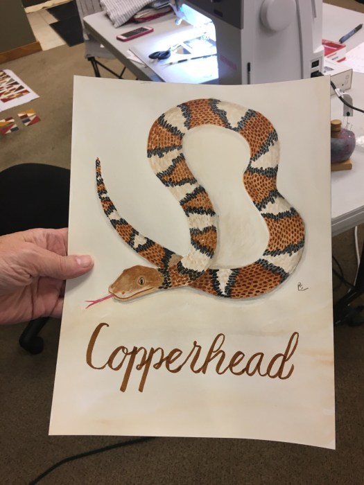 Pam doesn’t even bring fabric anymore. She has branched out with watercolors and is an accomplished potter. If we’re lucky she brings pieces we can buy. Look at this painting of a snake she made for her grandson who is obsessed with copperheads. Pretty scary sitting next to her!
