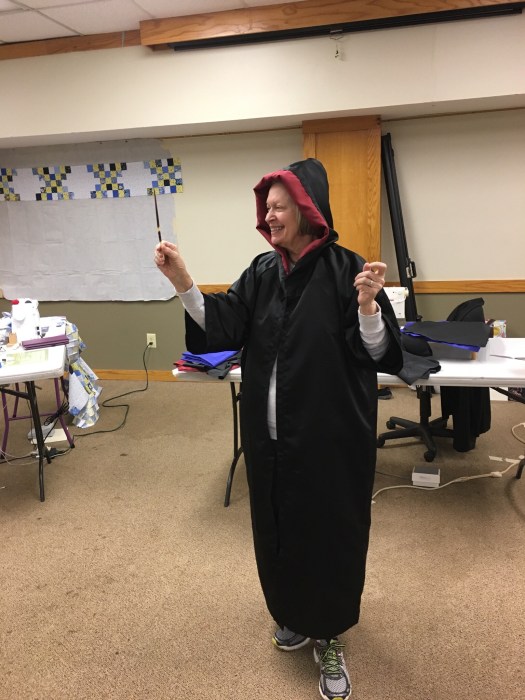 Edie, who is our Margarita Queen, works on authentic looking Harry Potter costumes for her grandkids. Fortunately, tiny Becky’s just the right size to be the model for a Griffindor cape.